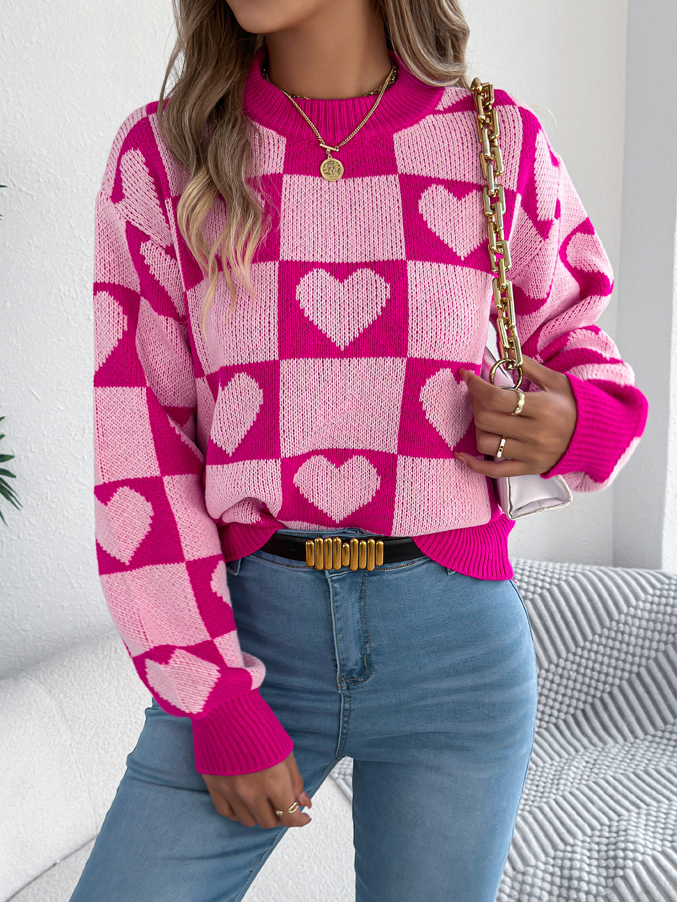 Women's Love Plaid Lantern Long Sleeve Pullover Sweater
